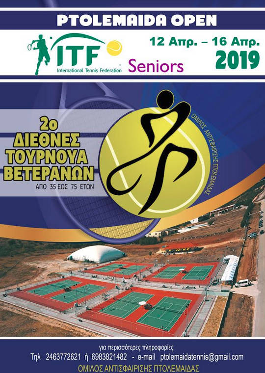 Ο Όμιλος Αντισφαίρισης Πτολεμαΐδας, σε συνεργασία με την Διεθνή Ομοσπονδία τένις και την Ελληνική Φίλαθλη Ομοσπονδία Αντισφαίρισης , διοργανώνουν το 2ο διεθνές, βαθμολογούμενο, τουρνουά τένις βετεράνων , ( το 2o PTOLEMAIDA OPEN SENIORS) , ανδρών – γυναικών για ηλικίες από 35 έως 75 ετών.