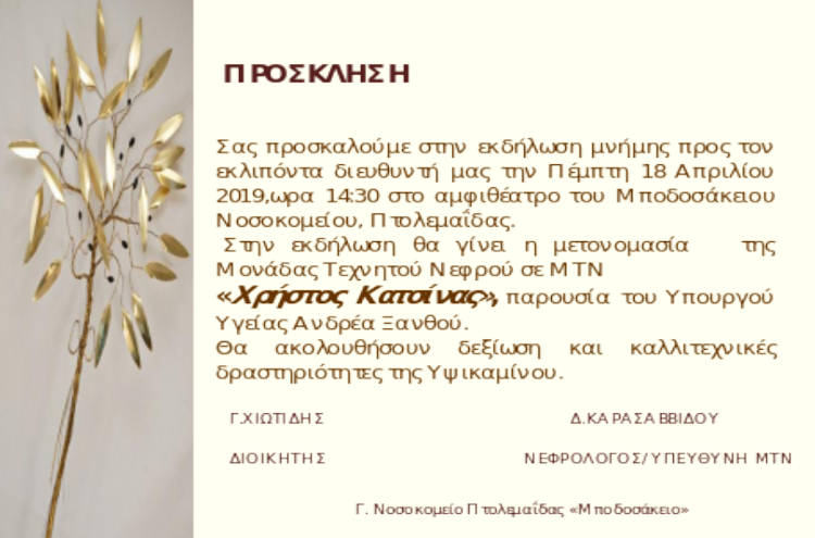 Εκδήλωση μνήμης προς τον εκλιπόντα Χρήστο Κατσίνα και μετονομασία της Μονάδας Τεχνητού Νεφρού του Νοσοκομείου Πτολεμαΐδας παρουσία του Υπουργού Υγείας Αν. Ξανθού