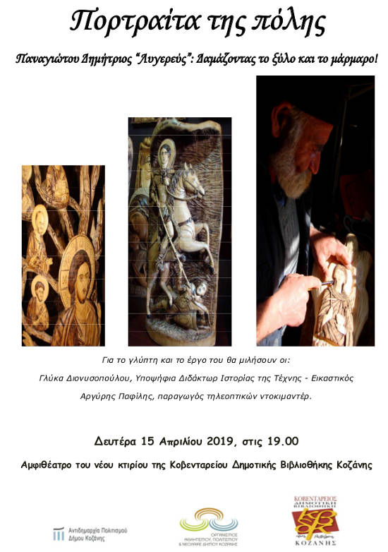 Ο Δήμος Κοζάνης και η Αντιδημαρχία Πολιτισμού παρουσιάζουν στα πλαίσια της σειράς “Πορτραίτα της πόλης” εκδήλωση αφιερωμένη στο γλύπτη, ξύλου και μαρμάρου, Δημήτρη Παναγιώτου, γνωστός ως “Λυγερεύς”, με τίτλο “Δαμάζοντας το ξύλο και το μάρμαρο”.