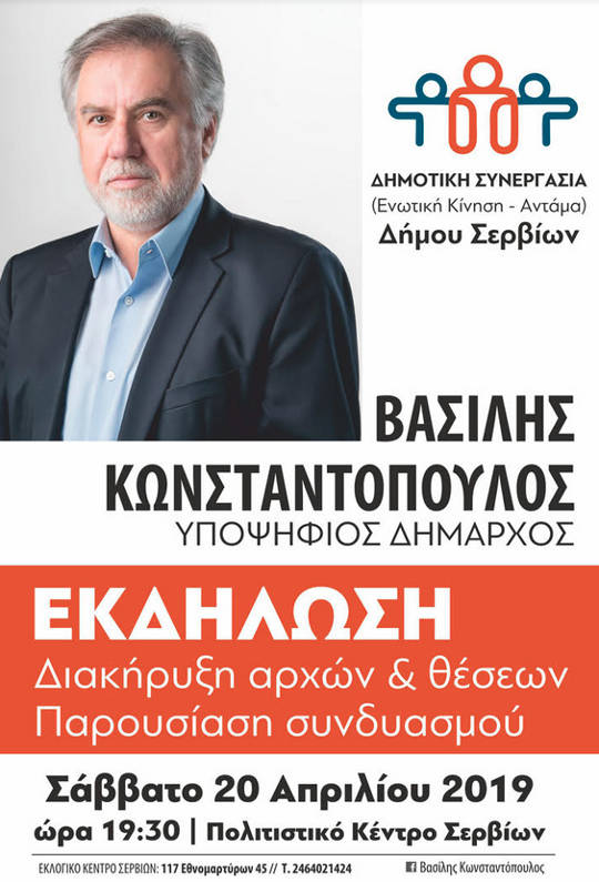 Σας προσκαλούμε στην εκδήλωση διακήρυξης αρχών & θέσεων και στην παρουσίαση των υποψηφίων δημοτικών συμβούλων του συνδυασμού Δημοτική Συνεργασία Δήμου Σερβίων το Σάββατο 20 Απριλίου 2019 και ώρα 19.30 στο Πολιτιστικό Κέντρο Σερβίων.