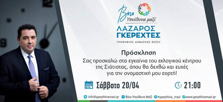 Πρόσκληση για τα εγκαίνια του εκλογικού κέντρου Σιάτιστας του συνδυασμού του Λάζαρου Γκερεχτέ: