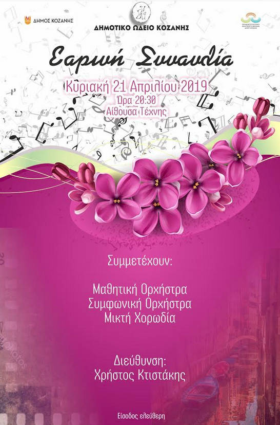 Ο Οργανισμός Αθλητισμού Πολιτισμού & Νεολαίας του Δήμου Κοζάνης και το Δημοτικό Ωδείο παρουσιάζουν την καθιερωμένη Εαρινή Συναυλία με τη συμμετοχή της Μικρής Ορχήστρας, της Συμφωνικής Ορχήστρας και της Μικτής Χορωδίας.