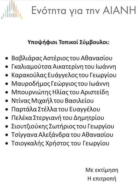 Αυτοδιοίκηση 24/04/2019 Οι υποψήφιοι Τοπικοί Σύμβουλοι «Ενότητα για την Αιανή» 0 Οι υποψήφιοι Τοπικοί Σύμβουλοι «Ενότητα για την Αιανή»