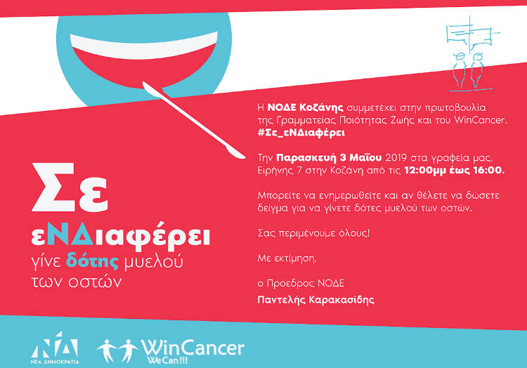 Η ΝΟ.Δ.Ε. Κοζάνης, συμμετέχοντας στην πρωτοβουλία #Σε_εΝΔιαφέρει της Γραμματείας Ποιότητας Ζωής ΝΔ και των Εθελοντών του Οργανισμού Κοινωνικής Αλληλεγγύης “WinCancer”, διοργανώνει εκδήλωση για τον αντικαρκινικό αγώνα, την Παρασκευή 3 Μαΐου 2019 στα Γραφεία του Κόμματος στην Κοζάνη (Πλατεία Ελευθερίας 7, 4ος όροφος).
