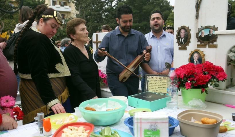 Ανήμερα της Κυριακής του Θωμά και πάνω στις ταφόπλακες των κοιμητηρίων βρίσκονται κόκκινα αυγά, μεζέδες, γλυκά, κρασί. Τα κεράσματα πάνε και έρχονται, το ίδιο και τα γέλια, κάποιοι στήνουν και κανονικά τραπέζια για ένα τσιμπούσι, όπως θα έκαναν στο σπίτι τους. Η ποντιακή λύρα αυτή τη μέρα θεωρείται απαραίτητη, μόνο που δεν παίζει μακρύν καϊτέ, αλλά χαρούμενους σκοπούς.