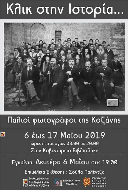 Η έκθεση που έχει τον τίτλο “ΚΛΙΚ ΣΤΗΝ ΙΣΤΟΡΙΑ- Παλιοί Φωτογράφοι της Κοζάνης” διοργανώνεται από το Σύλλογο Φίλων Δημοτικής Βιβλιοθήκης, το Εμπορικό και Βιομηχανικό Επιμελητήριο και την Κοβεντάρειο Δημοτική Βιβλιοθήκη Κοζάνης, ενώ την επιμέλεια της έκθεσης έκανε η κ. Σούλα Παλέντζα.