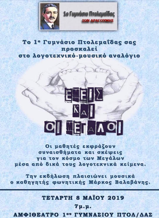 Οι μαθητές εκφράζουν συναισθήματα και σκέψεις για τον κόσμο των Μεγάλων μέσα από δικά τους λογοτεχνικά κείμενα. Την εκδήλωση πλαισιώνει μουσικά ο καθηγητής φωνητικής Μάρκος Βαλαβάνης.