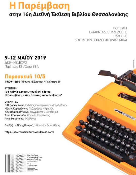 Την Παρασκευή 10 Μαϊου, ώρα 15.00, στην Αίθουσα ‘’Εξώστης’’–Περίπτερο 15, η Παρέμβαση θα πραγματοποιήσει εκδήλωση–συζήτηση με θέμα: «35 χρόνια Δονκιχωτισμοί επί χάρτου. Η Παρέμβαση, ο Δον Κιχώτης κι ο Θερβάντες». Ομιλητές: Β.Π.Καραγιάννης, Εκδότης–Συγγραφέας, Μάκης Καραγιάννης, Πεζογράφος–Κριτικός, Δήμητρα Καραγιάννη, Συνεκδότρια–Συγγραφέας, Άννα Κουστινούδη, Κριτικός λογοτεχνίας, Άννα Μαμάτσιου, Φιλόλογος. Διαβάζει ο Νίκος Κουρού, Ηθοποιός – Σκηνοθέτης.