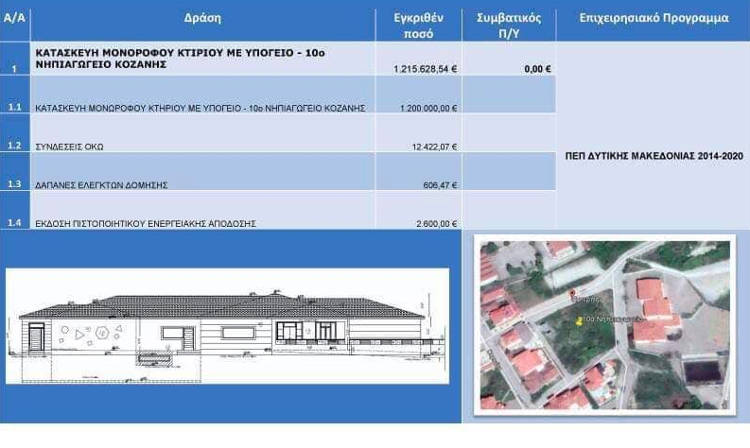 Ολοκληρώνονται επίσης οι οι διαδικασίες και δημοπρατείται σε πολύ σύντομο χρονικό διάστημα το 15ο Νηπιαγωγείο. Το κτίριο θα ανεγερθεί στην πόλη της Κοζάνη, επί της οδού Ολύμπου, σε οικόπεδο έκτασης 769,40τμ.