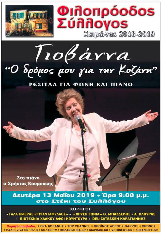 Ο Φιλοπρόοδος Σύλλογος σας προσκαλεί τη Δευτέρα 13 Μαΐου 2019 και ώρα 9 το βράδυ σ’ ένα μοναδικό ρεσιτάλ για φωνή και πιάνο, στο ρεσιτάλ της Γιοβάννας με τίτλο «Ο δρόμος μου για την Κοζάνη».