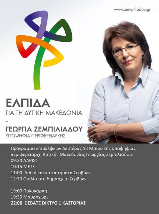 Αυτό τόνισε η υποψήφια Περιφερειάρχης Γεωργία Ζεμπιλιάδου στην περιοδεία της στην Καστοριά και στις διάφορες συναντήσεις που είχε αναφέρθηκε αναλυτικά στο πρόγραμμα που έχει εκπονήσει ο συνδυασμός ΕΛΠΙΔΑ, υπογραμμίζοντας ότι “ Χρήματα βρίσκονται, αλλά είναι στα ευρωπαϊκά προγράμματα, που κάποιος πρέπει να τα γνωρίζει, να μπορεί να τα διαβάσει σωστά και να κάνει τις κατάλληλες προτάσεις. Η Ευρώπη έχει χρήμα και το διαθέτει αν πειστεί για τη σοβαρότητα και την αρτιότητα του σχεδίου που θα προτείνεις.