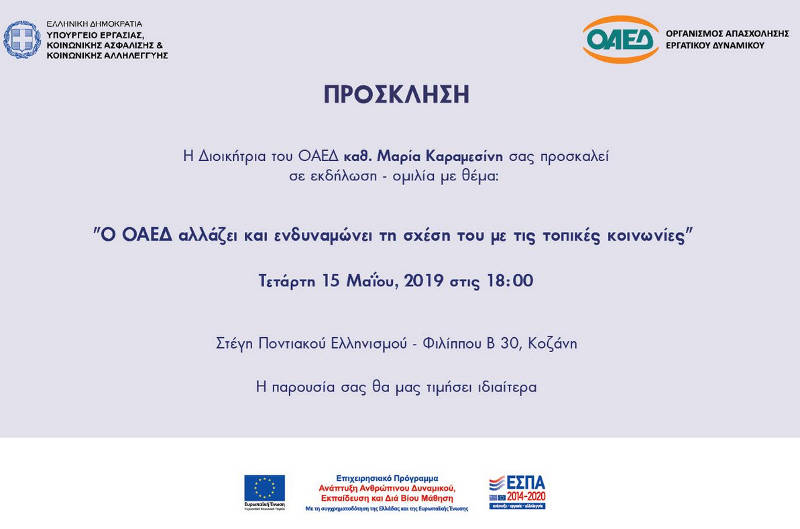 Κοζάνη 12/05/2019 Εκδήλωση του ΟΑΕΔ στην Κοζάνη «Ο ΟΑΕΔ αλλάζει και ενδυναμώνει τη σχέση του με τις τοπικές κοινωνίες» 0 Εκδήλωση του ΟΑΕΔ στην Κοζάνη «Ο ΟΑΕΔ αλλάζει και ενδυναμώνει τη σχέση του με τις τοπικές κοινωνίες»