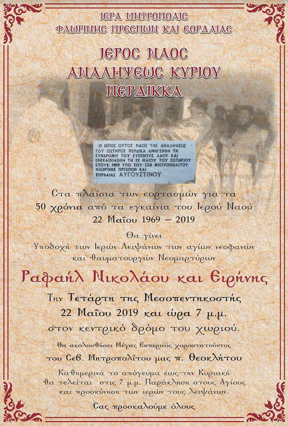 Ο εορτασμός για τα 50 χρόνια από τα εγκαίνια του Ι.Ν. Αναλήψεως Περδίκκα