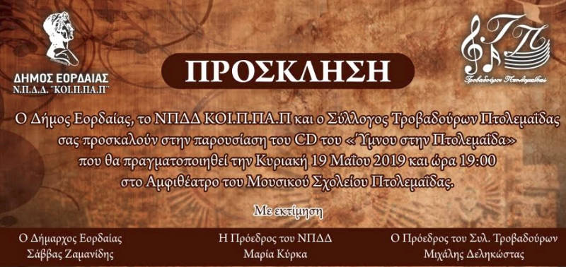 Μετά τις αρχαιρεσίες που διενεργήθηκαν στις 05 Μαΐου 2019 για την εκλογή νέου Διοικητικού Συμβουλίου και Εξελεγκτικής Επιτροπής, στο Σύλλογο Τροβαδούρων Πτολεμαΐδας, ανακοινώνουμε ότι τη νέα σύνθεση αυτών είναι.