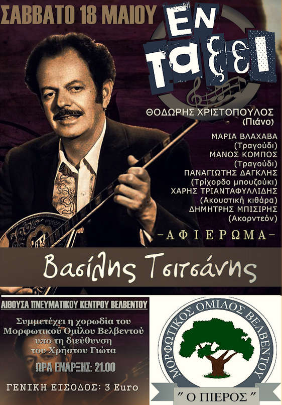 O Μορφωτικός Όμιλος Βελβεντού παρουσιάζει εκδήλωση – αφιέρωμα στον Βασίλη Τσιτσάνη με το συγκρότημα “Εν τάξει”, το Σάββατο 18 Μαΐου 2019, ώρα έναρξης 21.00 στην αίθουσα του Πνευματικού Κέντρου Βελβεντού.