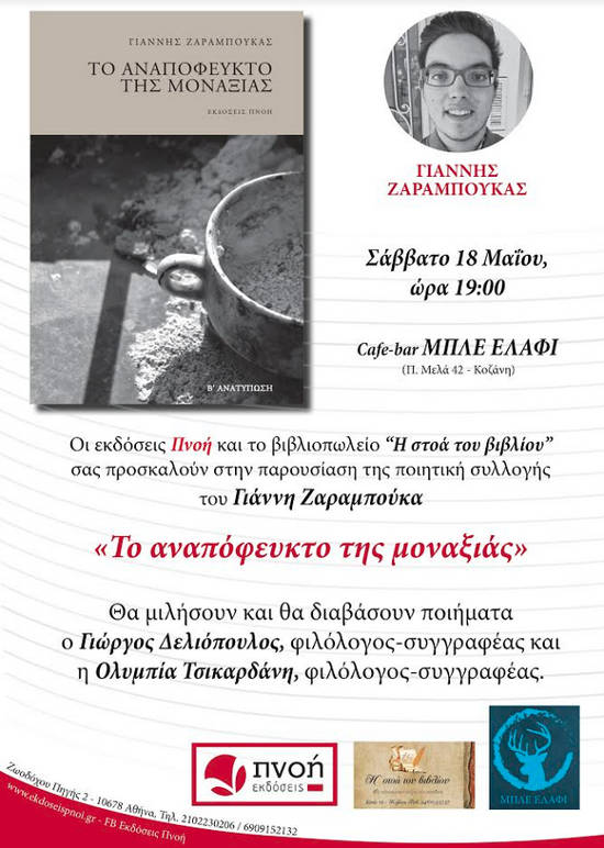 Το βιβλιοπωλέιο η “Στοά του βιβλίου” και οι εκδόσεις Πνοή σας προσκαλούν στην παρουσίαση της ποιητικής συλλογής του Γιάννη Ζαραμπούκα “Το αναπόφευκτο της μοναξιάς” το Σάββατο 18 Μαϊου στις 19:00 στο cafe-bar Μπλέ Ελάφι (Π.Μελά 42).
