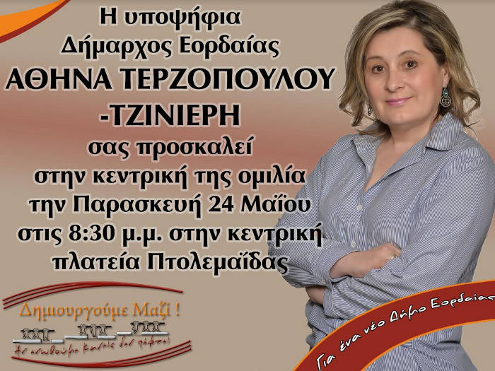 Η υποψήφια Δήμαρχος Εορδαίας ΑΘΗΝΑ ΤΕΡΖΟΠΟΥΛΟΥ-ΤΖΙΝΙΕΡΗ, επικεφαλής του συνδυασμού «Δημιουργούμε Μαζί!», σας προσκαλεί στην κεντρική της ομιλία την Παρασκευή 24 Μαΐου στις 8:30 μ.μ. στην κεντρική πλατεία Πτολεμαΐδας.