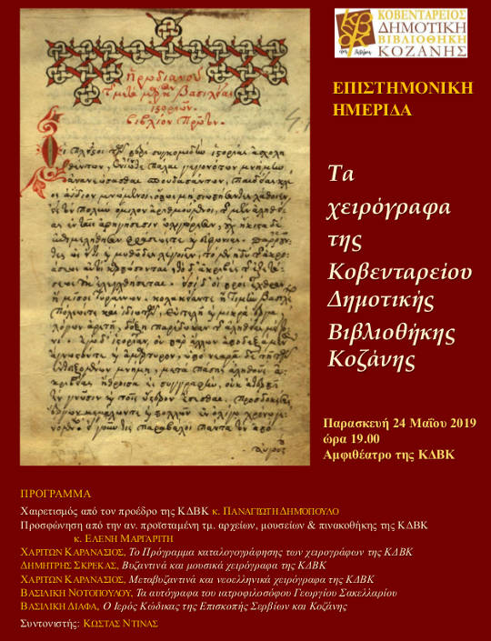 Στο πλαίσιο του Προγράμματος «Σύνταξη αναλυτικού περιγραφικού Καταλόγου των χειρογράφων της ΚΔΒΚ, κώδ. 1-100», το οποίο έχουμε αναλάβει από κοινού με τον δρ. βυζ. φιλ. Δ. Σκρέκα, οργανώνουμε σε συνεργασία με τη Βιβλιοθήκη Κοζάνης Σεμινάριο Παλαιογραφίας καθώς και Ημερίδα για τα χειρόγραφα της ΚΔΒΚ στο Αμφιθέατρο της Βιβλιοθήκης.