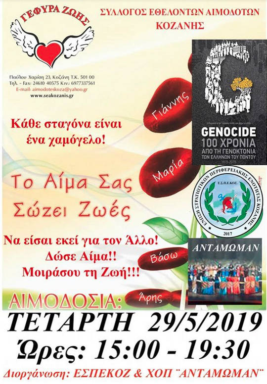 Ο Χορευτικός Όμιλος Ποντίων ¨ΑΝΤΑΜΩΜΑΝ¨ & Η Ένωση Στρατιωτικών Περιφερειακής Ένωσης Κοζάνης(ΕΣΠΕΚΟΖ) συμμετέχουν στην Αιμοδοσία μνήμης, «Δίνω Αίμα, για το Αίμα που χάθηκε… στη μνήμη των γενοκτονημένων Ελλήνων του πόντου», στα γραφεία του Συλλόγου, Π. Χαρίση 23, την Τετάρτη 29 Μαΐου 2019 από 15:00 – 20:00, (προσέλευση μέχρι 19:30 -Τρώμε ελαφρύ γεύμα 3ώρες πριν).