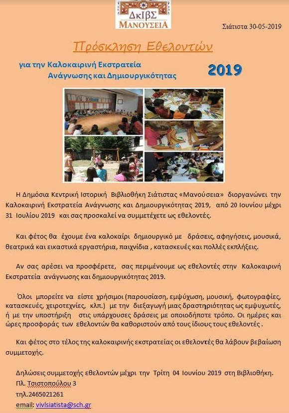 Βόιο 31/05/2019 Βιβλιοθήκη Σιάτιστας: Πρόσκληση εθελοντών για την καλοκαιρινή εκστρατεία Ανάγνωσης και Δημιουργικότητας 0 Βιβλιοθήκη Σιάτιστας: Πρόσκληση εθελοντών για την καλοκαιρινή εκστρατεία Ανάγνωσης και Δημιουργικότητας. Περισσότερες πληροφορίες στην παρακάτω αφίσα: