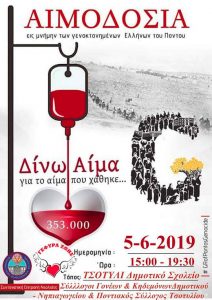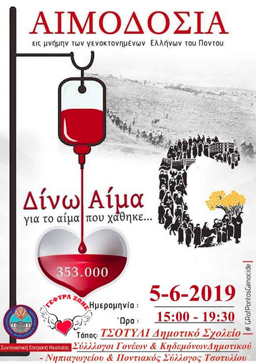 Το Π.Ε.Ν. Δυτ. Μακεδονίας & Ηπείρου και σε συνεργασία με τον σύλλογο Εθελοντών Αιμοδοτών Κοζάνης ”Γέφυρα Ζωής”, στο πλαίσιο των εκδηλώσεων της γενοκτονίας των Ελλήνων του Πόντου αποφάσισε οι προγραμματισμένες αιμοδοσίες του συλλόγου να γίνουν σε συνεργασία και με τους κατά τόπους ποντιακούς συλλόγους για το αδικοχαμένο αίμα των προγόνων μας κατά τη διάρκεια του διαπραχθέντος εγκλήματος.