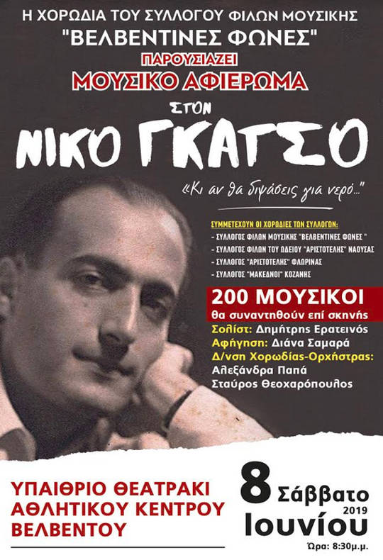 Πρόκειται για μια σύμπραξη τεσσάρων χορωδιών που παρουσιάζουν ταυτόχρονα το αφιέρωμα στον ποιητή και στιχουργό Νίκο Γκάτσο. Οι 200 χορωδοί από τις χορωδίες: Σύλλογος Φίλων Μουσικής “Βελβεντινές Φωνές”, Σύλλογος “Μακεδνοί” Κοζάνης, Σύλλογος “Αριστοτέλης” Φλώρινας και Σύλλογος Φίλων του Ωδείου “Αριστοτέλης” Νάουσας υπόσχονται να “ξεδιψάσουν” το φιλόμουσο κοινό της ευρύτερης περιοχής του Βελβεντού με τραγούδια μοναδικά και αξέχαστα του μεγάλου μας δημιουργού.