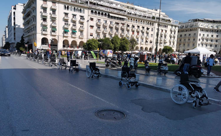 Τα αναπηρικά τους αμαξίδια τοποθέτησαν στη Λεωφόρο Νίκης, στο ύψος της πλατείας Αριστοτέλους στο πλαίσιο δράσης, που διοργάνωσε ο γνωστός για την δράση του σε θέματα ΑμεΑ, Δημήτρης Αντωνίου σε συνεργασία με τη Διεύθυνση Τροχαίας Θεσσαλονίκης και άλλους φορείς.