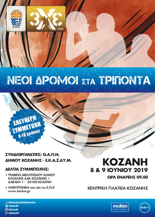 Το ΤΟΥΡΝΟΥΑ 3Χ3, ένα από τα πιο επιτυχημένα τουρνουά μπάσκετ 3Χ3 για αγόρια και κορίτσια 8 έως 18 ετών, που διοργανώνει η Ελληνική Ομοσπονδία Καλαθοσφαίρισης (Ε.Ο.Κ.) και η Ε.ΚΑ.ΣΥ.Δ.Μ, σε συνεργασία με τον Ο.Α.Π.Ν. Δήμου Κοζάνης θα πραγματοποιηθεί στην Κεντρική Πλατεία της Κοζάνης το Σάββατο 8/06/2019 και την Κυριακή 9/06/2019.