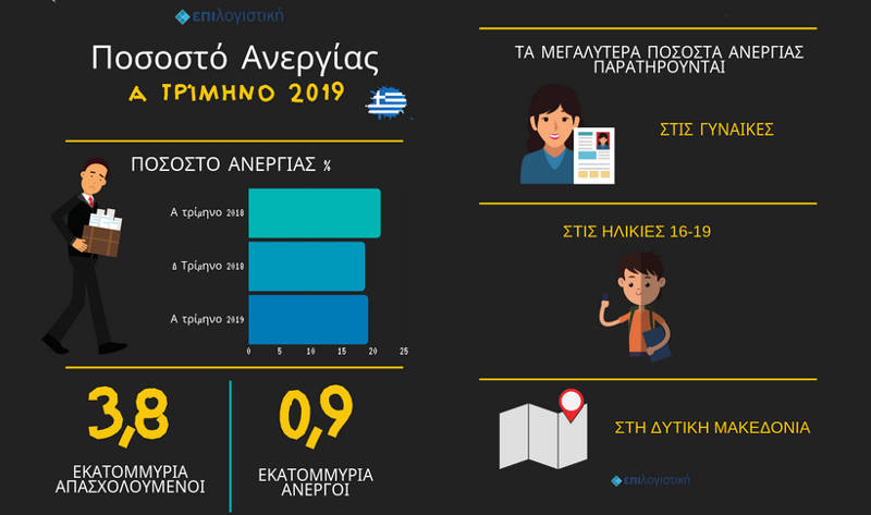 Η Ελληνική Στατιστική Αρχή (ΕΛΣΤΑΤ) ανακοινώνει τα αποτελέσματα της Έρευνας Εργατικού Δυναμικού για το A’ τρίμηνο του 2019.