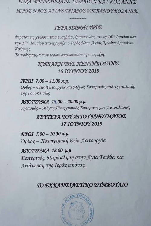 Πανηγυρίζει ο Ιερός Ναός Αγίας Τριάδας στο Δρέπανο Κοζάνης στις 16 & 17 Ιουνίου 2019 (Εορτασμός Αγίου Πνεύματος).
