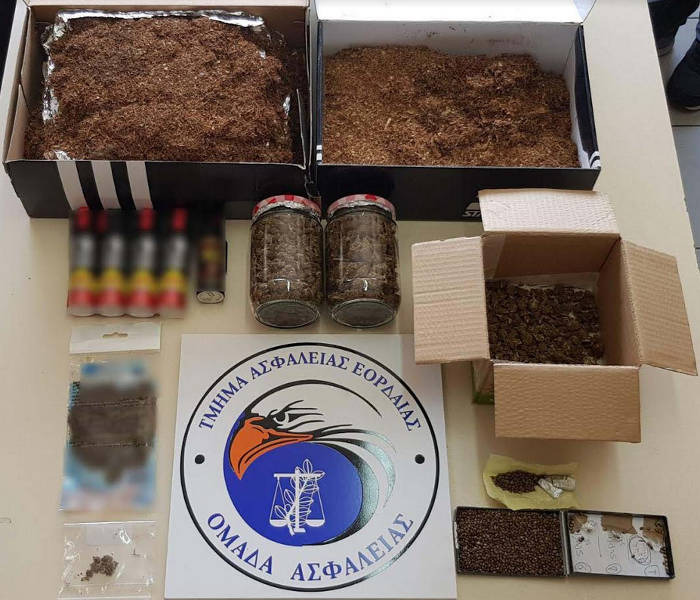 Κατασχέθηκαν συνολικά -243,45- γραμμάρια ακατέργαστης κάνναβης, -2.900- σπόροι κάνναβης, -2.042- γραμμάρια αδασμολόγητου καπνού και -5- σπρέι πιπεριού