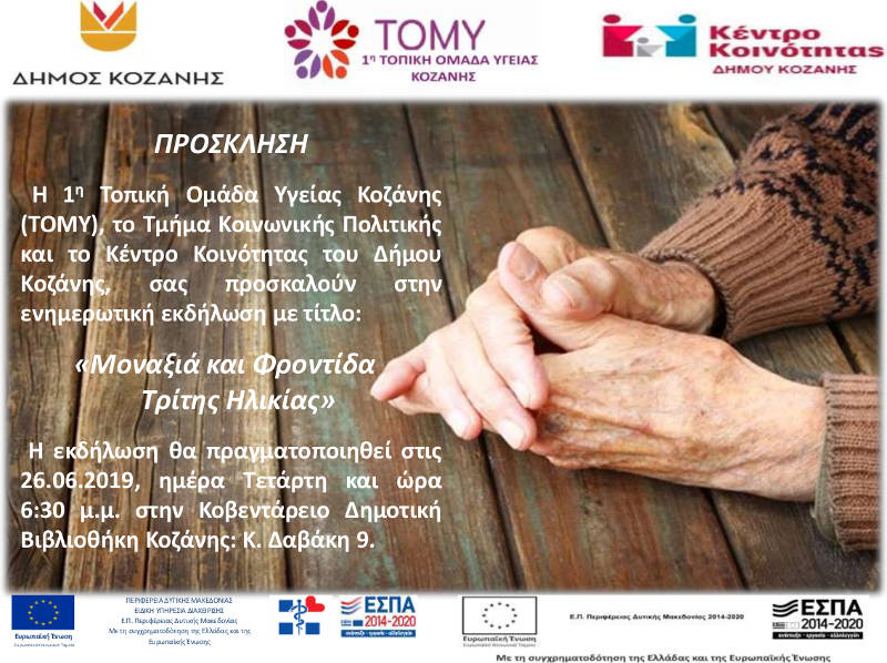 Κοζάνη 21/06/2019 Εκδήλωση από την 1η ΤΟΜΥ Κοζάνης για την μοναξιά και φροντίδα της 3ης ηλικίας 0 Εκδήλωση από την 1η ΤΟΜΥ Κοζάνης για την μοναξιά και φροντίδα της 3ης ηλικίας. Περισσότερες πληροφορίες στην παρακάτω πρόσκληση: