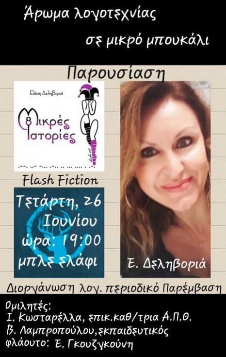 Πού; Στο Μπλε Ελάφι. Πότε; Την Τετάρτη, 26 Ιουνίου 2019, στις 19:00. Ποιος; Η Ελένη Δεληβοριά, εκπαιδευτικός και λάτρης της γραφής θα μας εισαγάγει στον κόσμο της μικρομυθοπλασίας, η Ιωάννα Κωσταρέλλα, επίκουρη καθηγήτρια τμήματος δημοσιογραφίας και Μ.Μ.Ε. του Α.Π.Θ. και η Βάια Λαμπροπούλου, εκπαιδευτικός, θα παρουσιάσουν και θα μοιραστούν κάποιες σκέψεις τους για το βιβλίο, ενώ η Ειρήνη Γκουζγκούνη θα μας ταξιδέψει μουσικά υπό τον ήχο του φλάουτου.