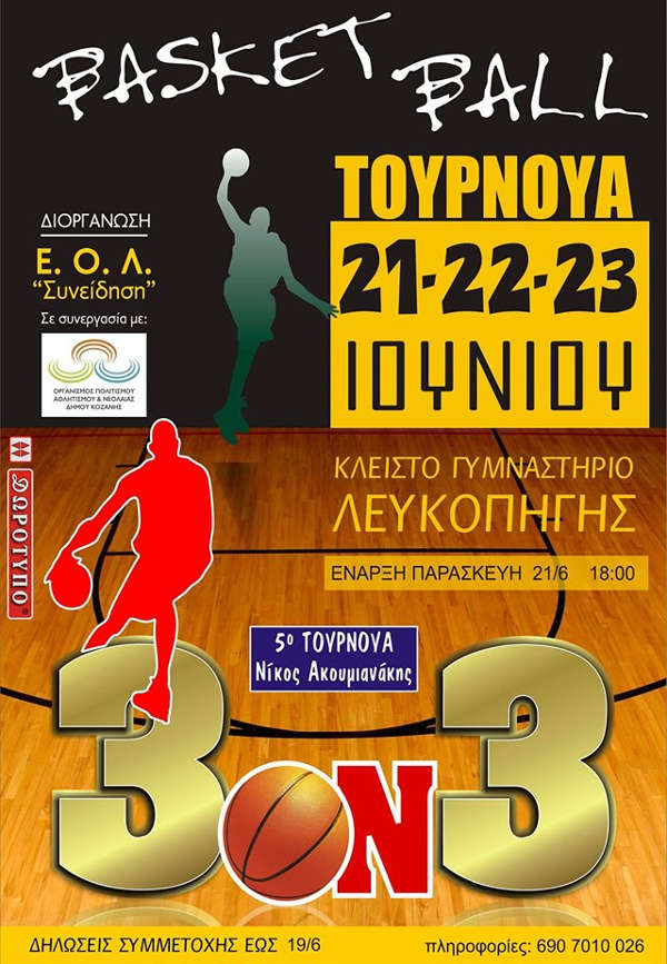Αθλητικά 21/06/2019 Στις 17:00 ξεκινάνε τα παιχνίδια του 5ου τουρνουά μπάσκετ 3χ3 “Νίκος Ακουμιανάκης” στη Λευκοπηγή Κοζάνης 0 Στις 17:00 σήμερα Παρασκευή 21 Ιουνίου ξεκινάνε τα παιχνίδια του 5ου τουρνουά μπάσκετ 3χ3 “Νίκος Ακουμιανάκης” στη Λευκοπηγή Κοζάνης Το τουρνουά φέτος θα διεξαχθεί με την παρουσία του παλαίμαχου άσσου του Άρη Θεσσαλονίκης Χάρη Παπαγεωργίου.