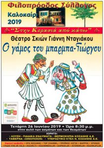 Ο Φιλοπρόοδος Σύλλογος προσκαλεί όλες και όλους στο φετινό πολιτιστικό καλοκαίρι και με μεγάλη χαρά καλωσορίζει τους πρώτους επίτιμους καλεσμένους και καλύτερούς του φίλους, τα μικρά παιδιά, σε μια γνήσια παράσταση Καραγκιόζη από το θέατρο σκιών του Γιάννη Νταγιάκου, κύριου εκφραστή της σχολής του Ευγένιου Σπαθάρη, με το ξεκαρδιστικό έργο «Ο γάμος του μπαρμπα-Γιώργου».