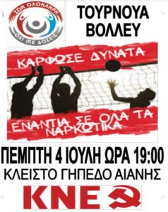 Οι νέοι να γυρίσουν την πλάτη στη ναρκω-κουλτούρα, στον συμβιβασμό και την μοιρολατρία. Κόντρα στις πολιτικές αθώωσης και ανοχής στα ναρκωτικά, στις αντιδραστικές αντιλήψεις περί καλών και κακών ναρκωτικών, της «ελευθερίας» αυτοδιάθεσης του σώματος, εμείς προάγουμε τις αξίες του αγώνα, της συλλογικότητας και της αλληλεγγύης. Παλεύουμε για ζωή στο μπόι των ονείρων και των αναγκών μας. Ζωή ολόκληρη, όχι με δόσεις! Δυναμώνουμε αυτήν τη φωνή παντού, τη φωνή του ΚΚΕ και της ΚΝΕ! Δίνουμε το “παρών” στο τουρνουά Βόλλευ την Πέμπτη, μικροί και μεγάλοι. Δηλώνουμε συμμετοχή στο 6979191003.
