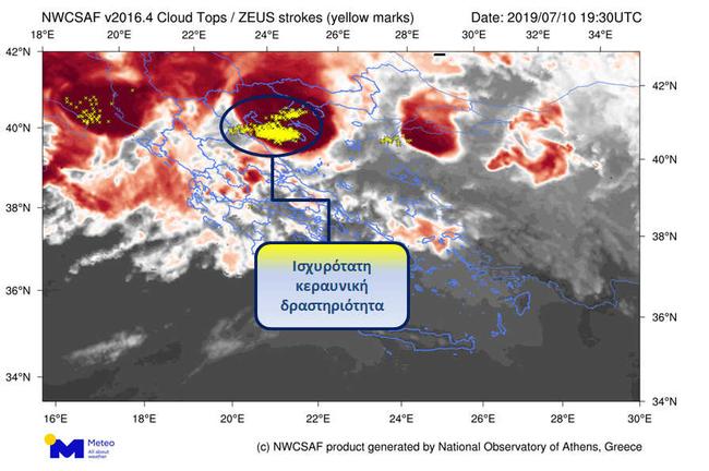 Ο Ευρωπαϊκός μετεωρολογικός δορυφόρος Meteosat – 11, κινούμενος σε γεωσύχρονη τροχιά παρέχει «εικόνες» της Ελληνικής επικράτειας κάθε 15 λεπτά της ώρας. Με τη χρήση αυτών των «εικόνων» και εξειδικευμένων αλγορίθμων σε συνδυασμό με τις καταγραφές του συστήματος εντοπισμού κεραυνικών χτυπημάτων «ΖΕΥΣ» του Εθνικού Αστεροσκοπείου Αθηνών, μπορούμε να έχουμε μια ακόμη πληρέστερη εικόνα της καταιγίδας που έπληξε το βράδυ της Τετάρτης 10/07/2019 τη Χαλκιδική.