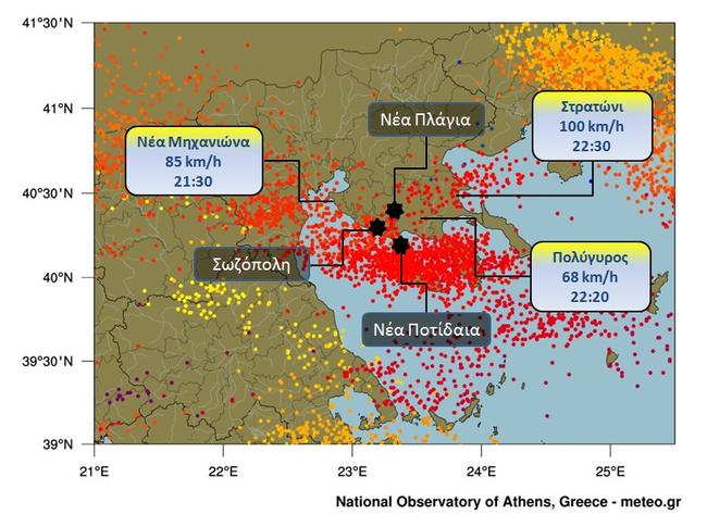 Στο χάρτη που ακολουθεί παρουσιάζονται: η έντονη ηλεκτρική δραστηριότητα καταγράφηκε από το σύστημα ανίχνευσης ηλεκτρικών εκκενώσεων του Εθνικού Αστεροσκοπείου Αθηνών/meteo.gr “ZEUS” στη Β. Ελλάδα, οι περιοχές όπου χάθηκαν ανθρώπινες ζωές και οι μεγαλύτερες ταχύτητες ανέμου στους πλησιέστερους μετεωρολογικούς σταθμούς του δικτύου μετεωρολογικών σταθμών του Εθνικού Αστεροσκοπείου Αθηνών / meteo.gr.