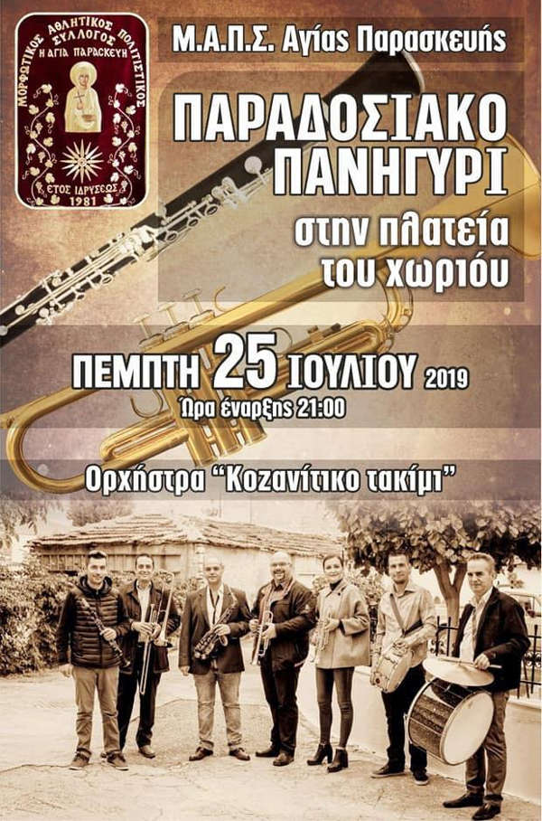 Κοζάνη 18/07/2019 Παραδοσιακό πανηγύρι στην Αγία Παρασκευή Κοζάνης από τον Σύλλογο του χωριού 0 Παραδοσιακό πανηγύρι στην Αγία Παρασκευή Κοζάνης από τον Σύλλογο του χωριού. Περισσότερες πληροφορίες στην παρακάτω αφίσα: