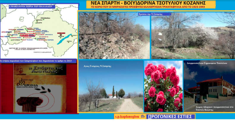 Στο ετήσιο περιοδικό που εκδίδει ένα από τα μεγαλύτερα προσφυγικά σωματεία και ίσως και το παλαιότερο στην Αθήνα η Ένωση Σπάρτης Μικράς Ασίας δημοσιεύθηκε άρθρο μας. που αναφέρετε σε ένα χωρίο της Κοζάνης στην περιοχή του Τσοτυλίου που δεν υπαρχή πια κάηκε από τους Ιταλούς το 1943 και ότι απέμεινε από τους Γερμανούς το 1944 και λεγόταν ΝΕΑ ΣΠΑΡΤΗ εις ανάμνηση της πατρίδας που άφησαν στην Μ. Ασια και λεγότανε ΣΠΑΡΤΗ (σημερινή ονομασία ISPARTA).Το χωρίο παλαιότερα λεγόταν ΒΟΥΔΟΡΙΝΑ και σε αυτό κατοικούσαν Βαλααδες.