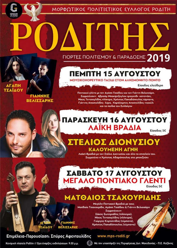 Κοζάνη 31/07/2019 Γιορτές Πολιτισμού και Παράδοσης 2019 στον Ροδίτη Κοζάνης – Δείτε το πρόγραμμα των εκδηλώσεων 0 Για 17η συνεχόμενη χρονιά οι μεγάλες καλοκαιρινές εκδηλώσεις πολιτισμού και παράδοσης είναι στον Ροδίτη Κοζάνης. Δείτε το πρόγραμμα των εκδηλώσεων στην παρακάτω αφίσα: