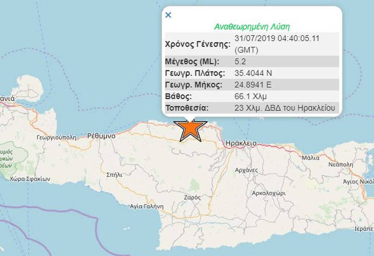 Το επίκεντρό του εντοπίστηκε στα 23 χλμ. δυτικά βορειοδυτικά της πόλης του Ηρακλείου και το εστιακό του βάθος στα 66 χλμ.