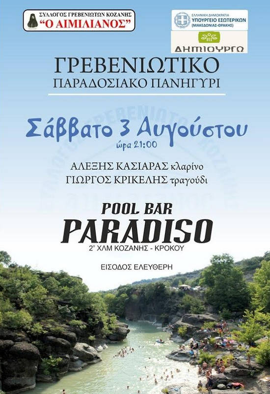 Στο «Γρεβενιώτικο Παραδοσιακό Πανηγύρι», που θα πραγματοποιηθεί στις 9 το βράδυ, στο Paradiso pool-bar στο 2ο χιλιόμετρο Κοζάνης-Κρόκου θα εμφανιστούν οι: Αλέξης Κασιάρα στο κλαρίνο και Γιώργος Κρικέλης στο τραγούδι.