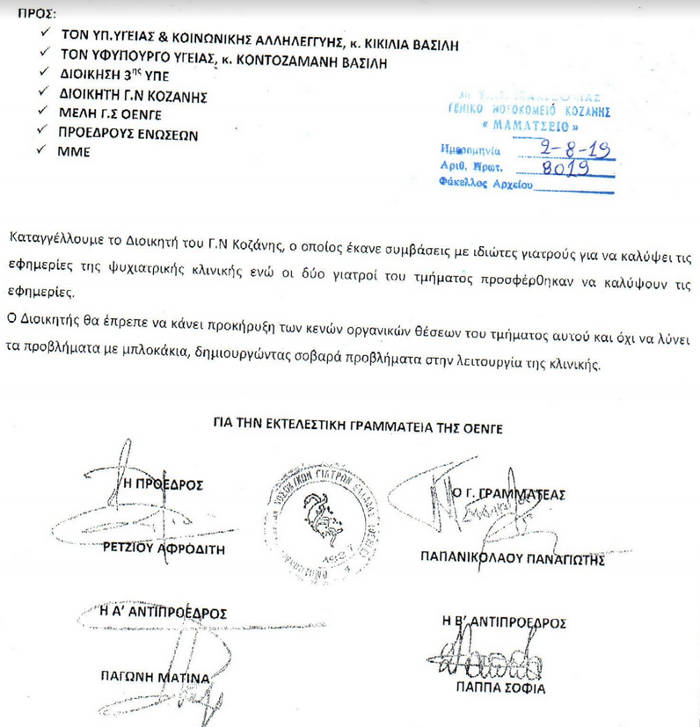 Από τα παραπάνω αυτονοήτως συνάγεται ότι η καταγγελία της Ο.Ε.Ν.Γ.Ε προς τον Διοικητή του Νοσοκομείου Κοζάνης είναι παντελώς ανυπόστατη, ψευδής και συκοφαντική, εκτός και αν η Ομοσπονδία θεωρεί ότι μία Κλινική, πόσο μάλλον η Ψυχιατρική Κλινική του Νοσοκομείου Κοζάνης που καλύπτει τις ανάγκες της Δυτικής Μακεδονίας, μπορεί να υποστηριχθεί πλήρως εφημεριακά με δύο μόνο γιατρούς και ότι αυτό μπορεί να γίνεται χωρίς προβλήματα στην εύρυθμη λειτουργία της, αλλά και την ασφάλεια, τόσο των ιατρών όσο και των ασθενών.