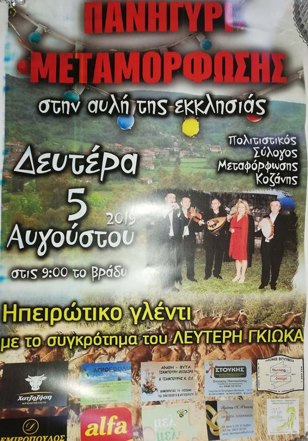 Κοζάνη 03/08/2019 Παραδοσιακό γλέντι στο πανηγύρι της Μεταμόρφωσης Κοζάνης 0 Παραδοσιακό γλέντι στο πανηγύρι της Μεταμόρφωσης Κοζάνης. Περισσότερες πληροφορίες στην παρακάτω αφίσα: