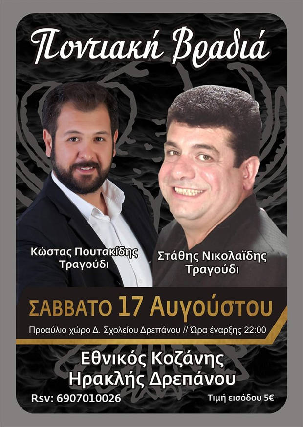 Μεγάλη ποντιακή βραδιά θα πραγματοποιηθεί το Σάββατο 17 Αυγούστου 2019 με τον Στάθη Νικολαΐδη και τον Κώστα Πουτακίδη στο Δρέπανο Κοζάνης.