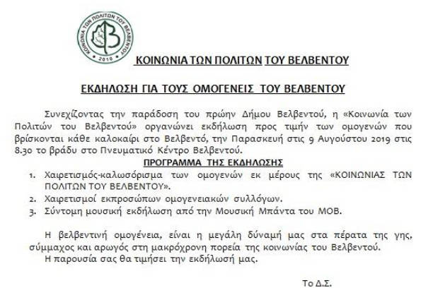 Σέρβια - Βελβεντό 07/08/2019 Εκδήλωση προς τιμήν των ομογενών του Βελβεντού 0 Εκδήλωση προς τιμήν των ομογενών του Βελβεντού