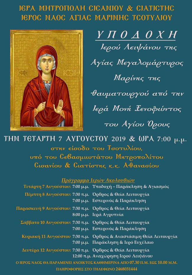 Βόιο 07/08/2019 Υποδοχή του Ιερού Λειψάνου της Αγίας Μαρίνας στον ομώνυμο Ι.Ν. Τσοτυλίου 0 Υποδοχή του Ιερού Λειψάνου της Αγίας Μαρίνας στον ομώνυμο Ι.Ν. Τσοτυλίου. Περισσότερες πληροφορίες στην παρακάτω αφίσα: