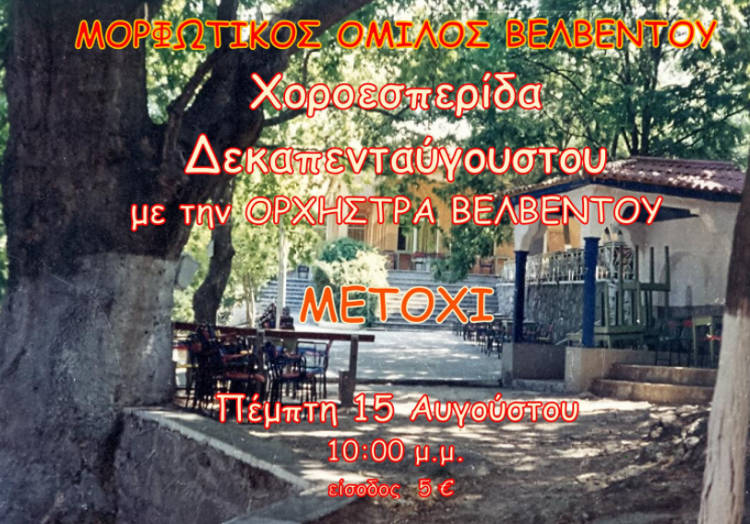 Σας προσκαλούμε στην καθιερωμένη ετήσια γενέθλια Χοροεσπερίδα του Μορφωτικού Ομίλου Βελβεντού που θα πραγματοποιηθεί και φέτος την Πέμπτη 15 Αυγούστου στο ΜΕΤΟΧΙ, με την ΟΡΧΗΣΤΡΑ ΒΕΛΒΕΝΤΟΥ. Στο μπουζούκι ο Φώτης Νατσιόπουλος και στο τραγούδι η Μαίρη Χανιώτη και ο Φώτης Νατσιόπουλος.