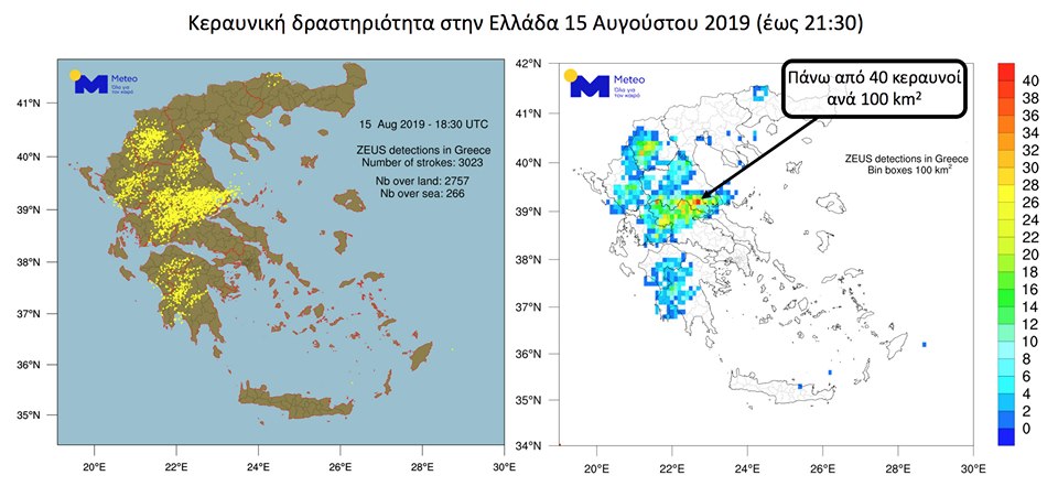 Αριστερά στον χάρτη βλέπετε τον απόλυτο αριθμό των κεραυνών που κατέγραψε το σύστημα ανίχνευσης ηλεκτρικών εκκενώσεων “ZEUS” έως τις 21:30, 15/08 και δεξιά την πυκνότητα των καταγραφών ανά 100 τετρ. χλμ